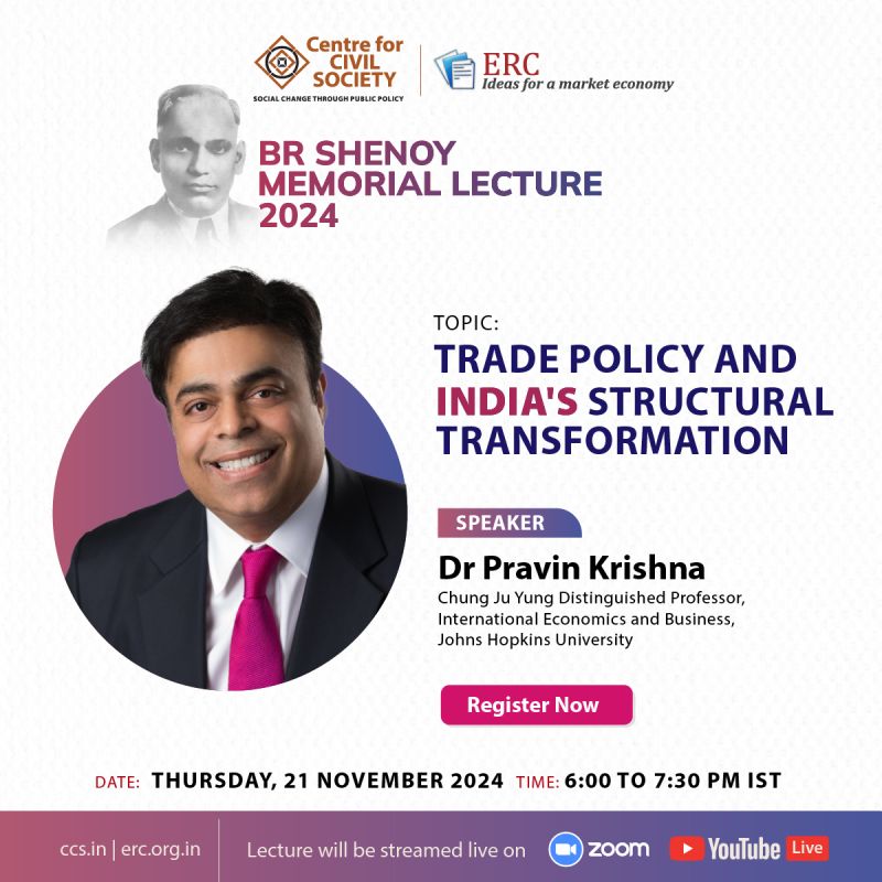 The Prof. B.R. Shenoy Lecture 2024 was delivered by Prof. Pravin Krishna, the Chung Ju Yung Distinguished Professor of International Economics and Business at Johns Hopkins University, where he is jointly appointed in the School of Advanced International Studies (SAIS) in Washington, DC and the Department of Economics in the Zanvyl Krieger School of Arts and Sciences (KSAS) in Baltimore.